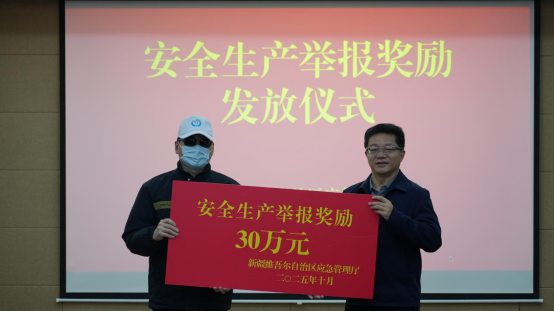 为深入贯彻落实习近平总书记关于安全生产重要论述和重要指示批示精神,践行“两个至上”安全发展理念,10月16日,自治区应急管理厅举行安全生产举报奖励发放仪式,向一名举报新疆某煤化工企业存在重大事故隐患的举报人现场发放30万元安全生产举报奖励,创下今年来全国安全生产举报奖励的单笔最高记录,成为自治区自开展安全生产举报奖励以来首例按照顶格标准发放的案例。自治区应急管理厅党委委员、副厅长周涛参加发放仪式。