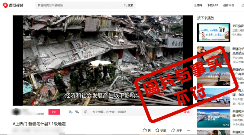 部分自媒体账号传播的乌什县路面损毁严重、房屋连片倒塌相关图文、视频信息不实。系网民利用AI自动生成技术,将乌什县7.1级地震有关信息与网络旧图合成的虚假信息,严重误导其他网民。