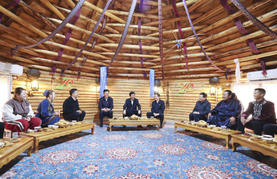 9月27日,受习近平总书记嘱托,中共中央政治局常委、全国政协主席、中央代表团团长王沪宁带领中央代表团部分成员到阿勒泰地区布尔津县考察。这是王沪宁和中央代表团部分成员在扎拉特乡村旅游专业合作社同村民交流。新华社记者姚大伟摄