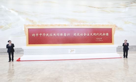 贺匾蔚为大观,习近平总书记“铸牢中华民族共同体意识建设社会主义现代化新疆”的题词寓意高远,中华同心尊庄重典雅,体现了党中央对新疆的深切关怀和殷切期望。仪式上,王沪宁和新疆维吾尔自治区党委书记陈小江,一同为贺匾和中华同心尊揭幕。