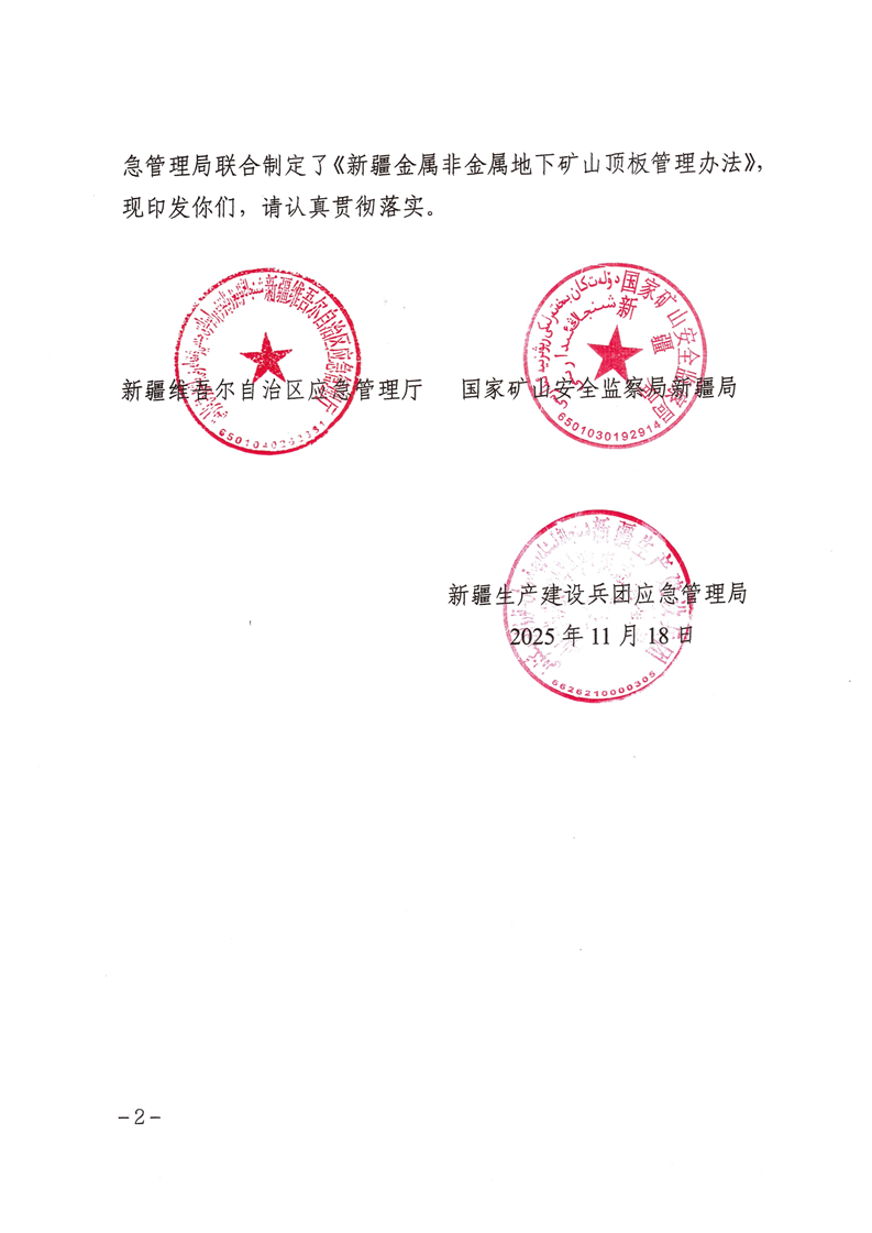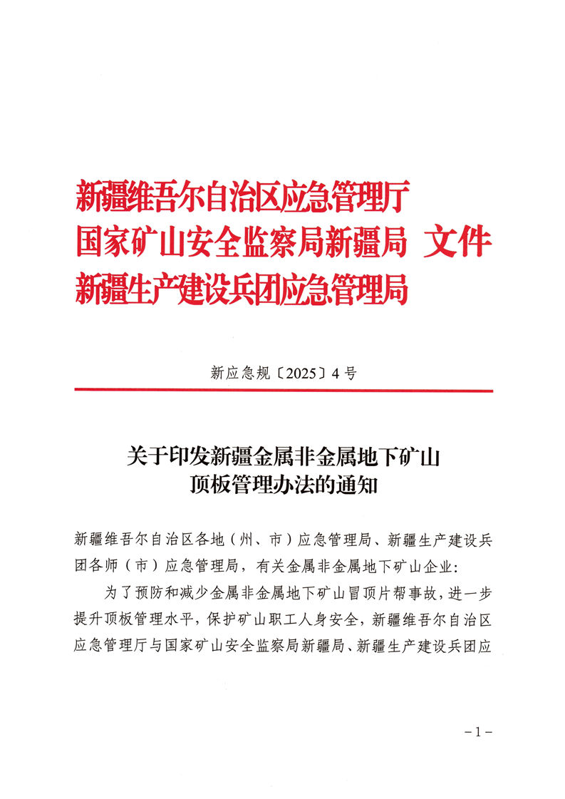 关于印发新疆金属非金属地下矿山顶板管理办法的通知