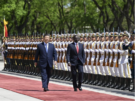 4月24日上午,国家主席习近平在北京人民大会堂同来华进行国事访问的肯尼亚总统鲁托举行会谈。这是会谈前,习近平在人民大会堂东门外广场为鲁托举行欢迎仪式。新华社记者岳月伟摄
