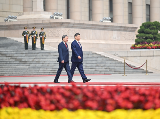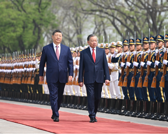 4月15日上午,中共中央总书记、国家主席习近平在北京人民大会堂同来华进行国事访问的越共中央总书记、国家主席苏林举行会谈。这是会谈前,习近平在人民大会堂东门外广场为苏林举行欢迎仪式。新华社记者 燕雁 摄