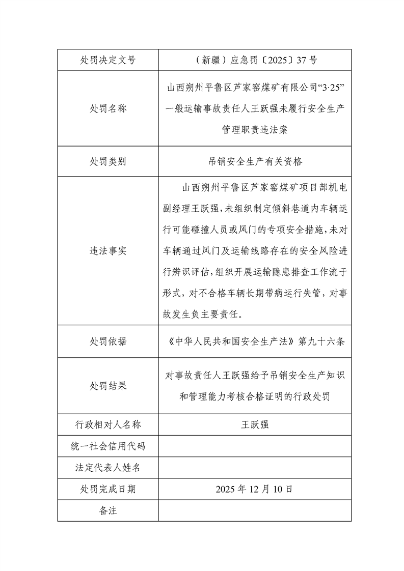 行政相对人:王跃强 处罚决定文号:(新疆)应急罚〔2025〕37号处罚公示
